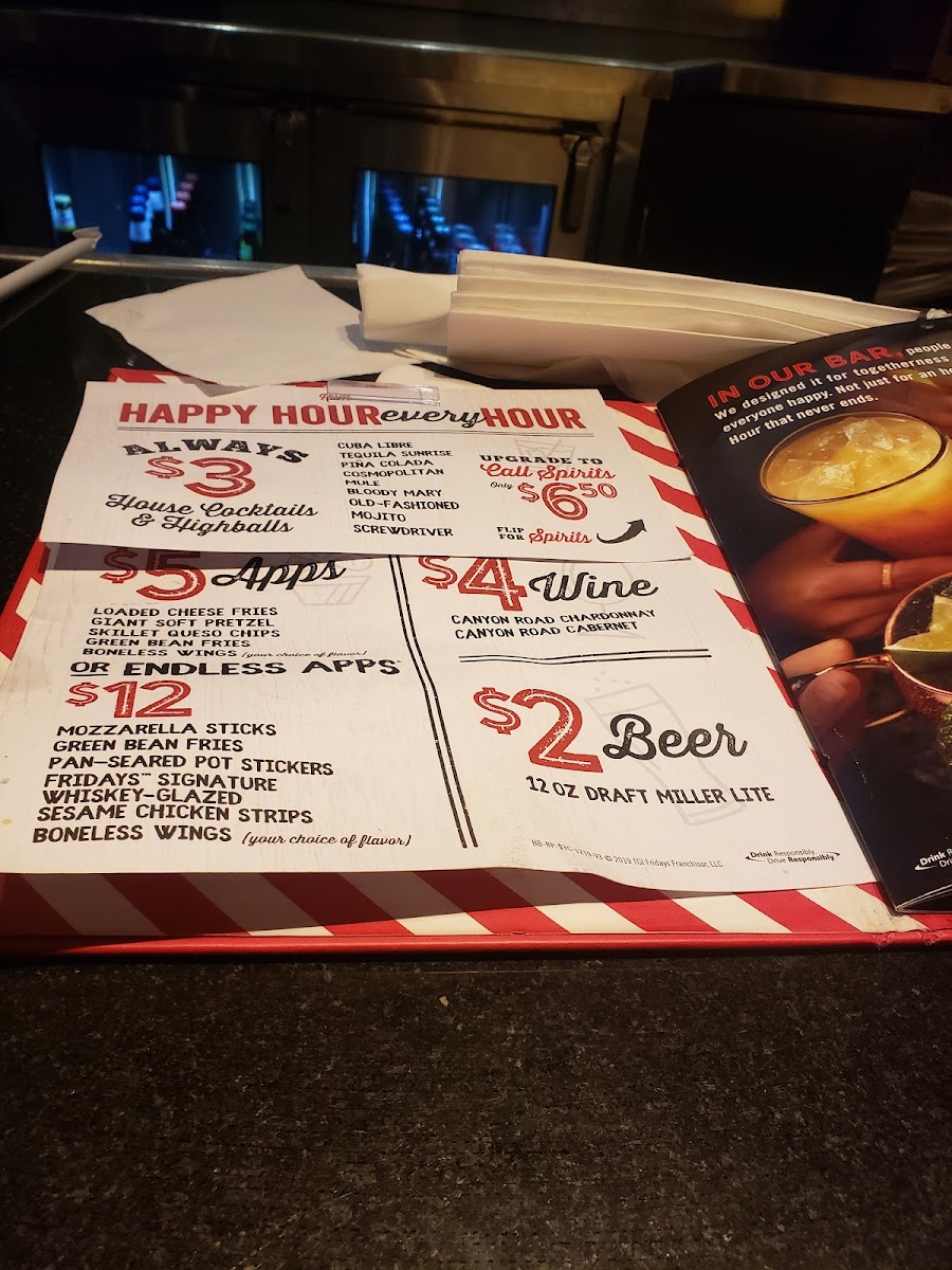 “ Sam the bartender is great, my go to. Usually a quiet atmosphere, good TGI Friday's food. Would recommend ”